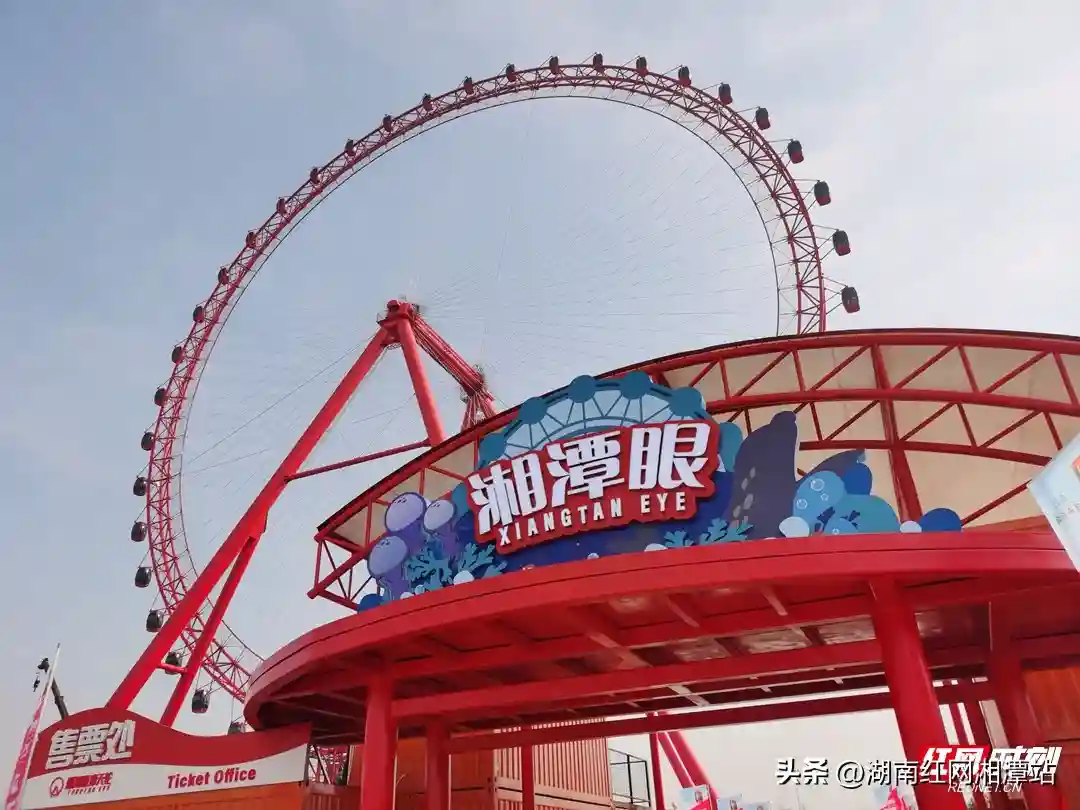 高达128米的“湘潭眼”摩天轮,建设耗时9个多月,占地约20亩,建筑面积1.33万㎡,是湖南省内目前最高摩天轮。其结合湘潭红色基因,以朝阳红为底色,共装挂42个座舱,每个座舱可乘6人,可同时供252人观光,旋转一周大约为25分钟。