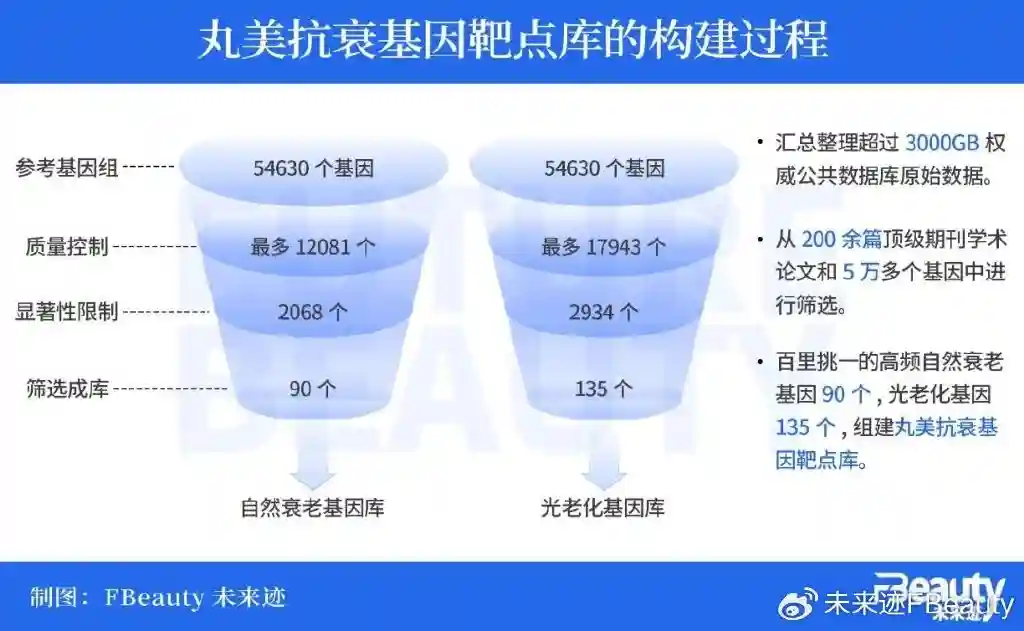 据《FBeauty未来迹》了解,目前丸美生物已经建立起了由23个眼部测试参数和7个眼部测试区域构成的“人体功效大数据平台”,可交叉测评38个眼部参数,实现测试数据的实时上传和汇总。此外,丸美生物还从5万多个基因中经过筛选,挑选出了90个高频自然衰老基因和135个光老化基因构建了“丸美抗衰基因靶点库”。