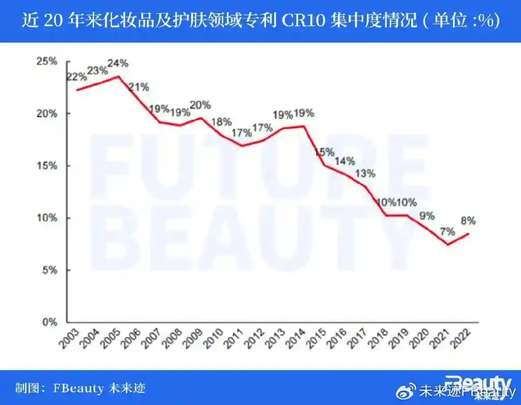检索全球专利数据库发现,TOP10化妆品企业所持有的专利数量在全部相关专利数中的占比已经从最高24%下滑到最低7%。换句话说,传统的头部化妆品企业对全球化妆品前沿技术的统御能力已经大不如前。