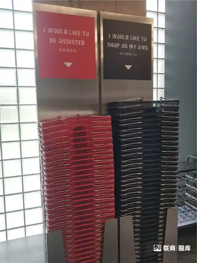 两种不同颜色的购物筐,红色代表着需要帮助,黑色代表着不想被打扰,顾客可以根据自己需求选择,比较贴心。