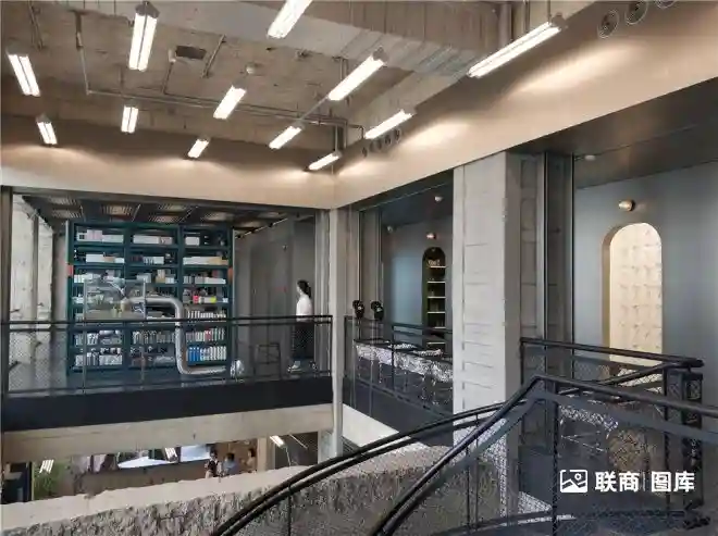 沿旋转楼梯可行至二层,映入眼帘的是两侧高大的绿色货架和拱形门的小房间。
