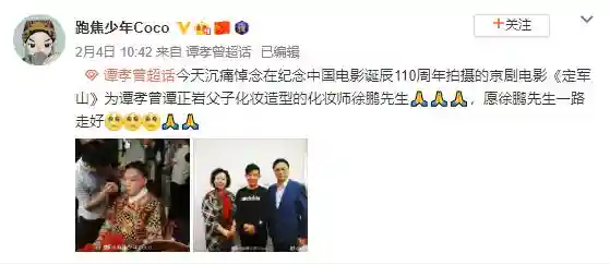 2月4日有多名知情人透露,知名化妆造型师徐鹏因病去世,据悉,他此前成为中国电影诞辰110周年拍摄的京剧电影《定军山》中谭孝曾谭正岩父子化妆,并且,还曾经在热播剧《鬓边不是海棠红》中担任造型师。