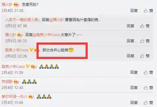 有网友看到他去世的消息,询问知情人他是怎么离开的?知情人回应称,“肺炎合并心脏病”。不知道徐鹏是早前就有旧疾,还是突发的意外,对于他的离开,两位知情人都在配文中表达了对他的悼念与惋惜。