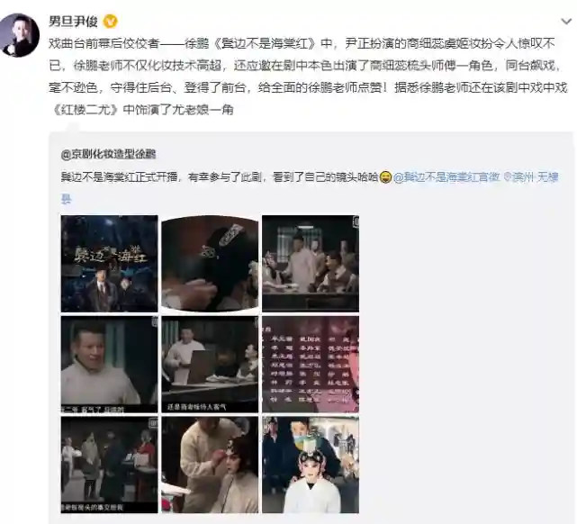徐鹏的好友曾经转发他在2020年晒过的一条微博,照片中能够看到,徐鹏为《鬓边不是海棠红》中的主演尹正化妆,以及与他在戏中飙戏。