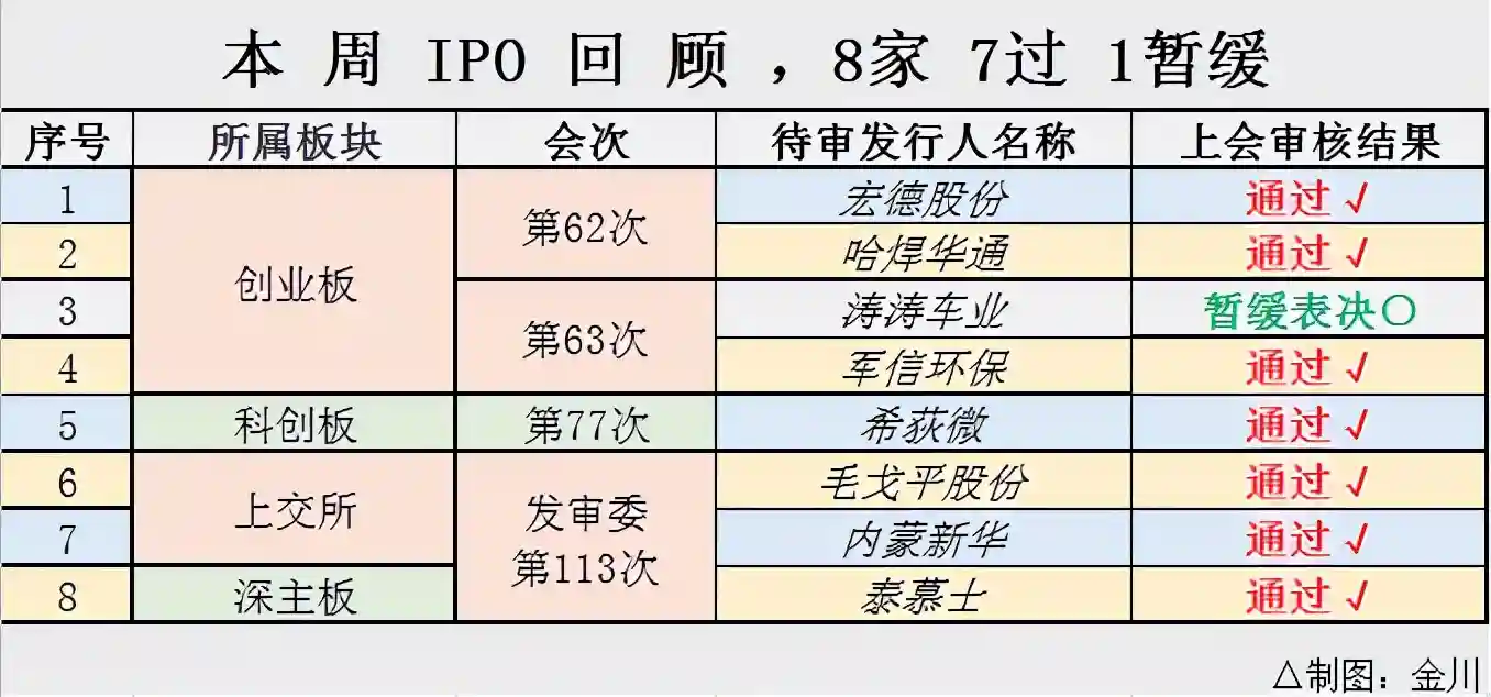 回顾本周,科创板、创业板、深主板以及上交所共上会8家企业,上交所2家,深主板1家,创业板4家,科创板1家。其中,哈焊所华通(常州)焊业股份有限公司、广东希荻微电子股份有限公司、浙江涛涛车业股份有限公司、和湖南军信环保股份有限公司在前篇已述,本文略过。