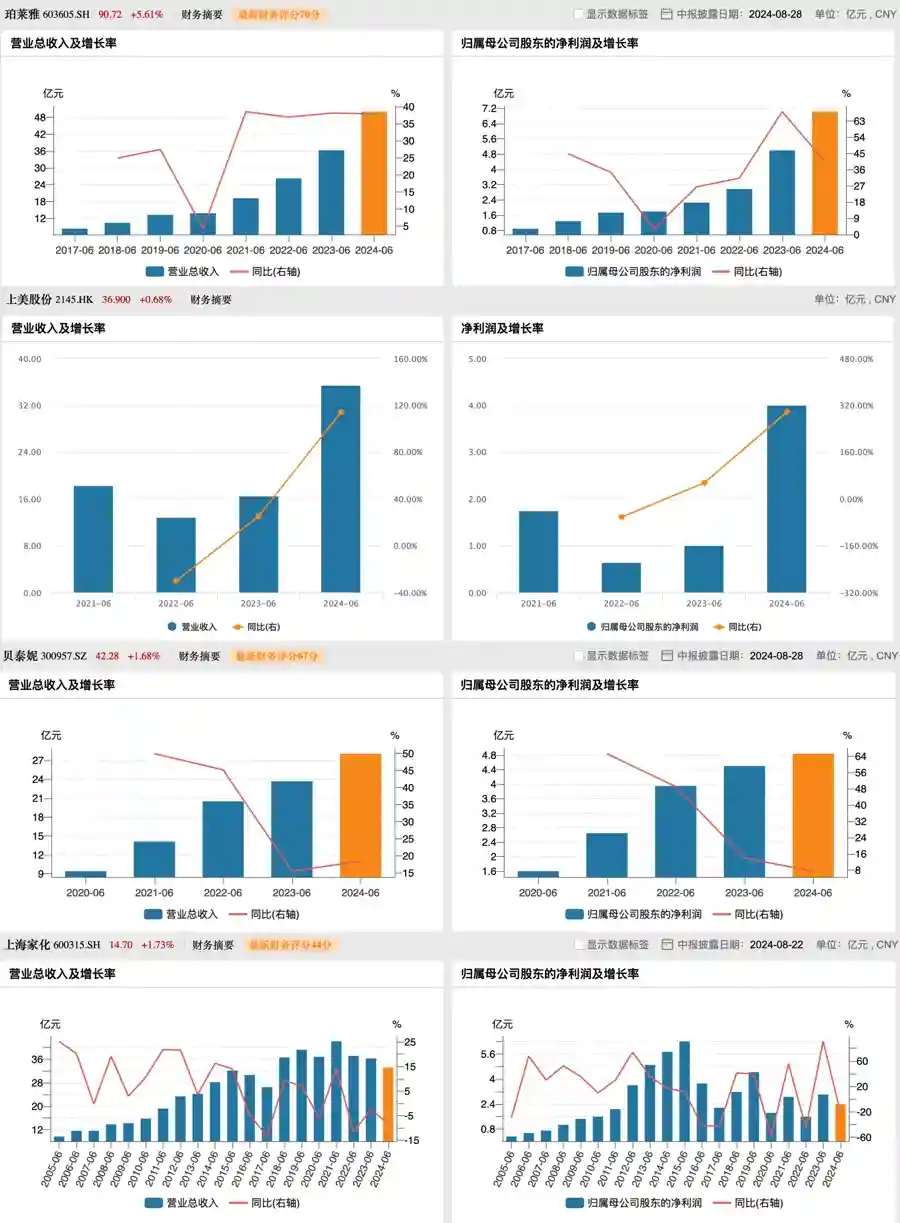 近日,珀莱雅(603605.SH)、上美股份(02145.HK)、贝泰妮(300957.SZ)、上海家化(600315.SH)四大上市国货美妆公司陆续披露了2024年上半年业绩。除上海家化外,三家营收净利均创历史新高,其中上美业绩实现倍增,珀莱雅和贝泰妮稳步增长,而上海家化营收、净利润则双双下滑。