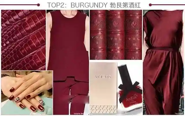 2.勃艮第酒红-是红色的一种,因与法国勃艮第所出产的勃艮第酒颜色相似而得名,与栗色相似。勃艮第酒红在最近几年的非常受青睐,在16春夏女装设计中依然扮演着及其重要的角色。