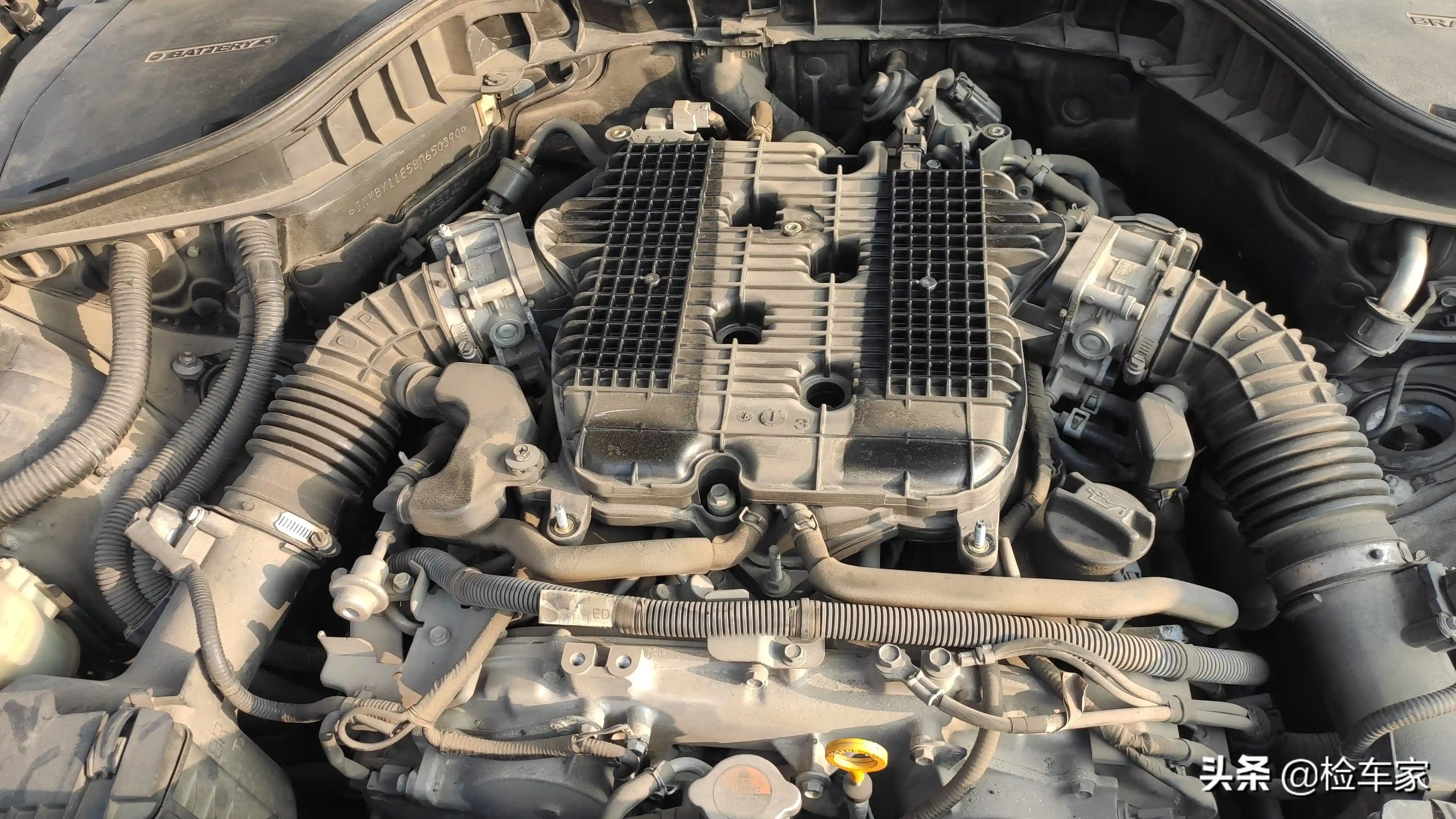 接下来在落日黄昏中检测发动机舱。这就是文章开头隆重介绍的VQ37发动机,双进气口,最大功率346匹马力,峰值扭矩363牛米,匹配7挡手自一体变速箱,动力可以说澎湃汹涌,大多数车都是惹不起的。