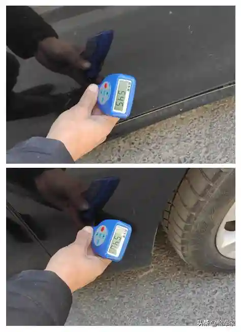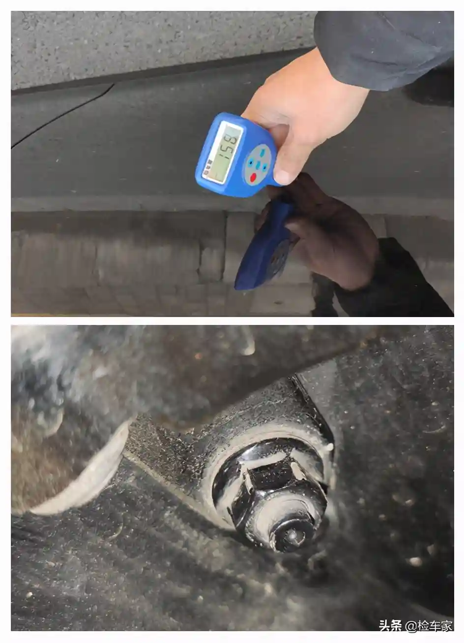 查验到右后门,发现右后门漆面厚度虽然不高,但是表面存在明显的喷漆痕迹,难道右后门也有过更换?然后打开车门查验门铰链螺丝也都有拆卸,综合分析右后门有过更换,好在右后门内侧正常,说明是单向损伤。