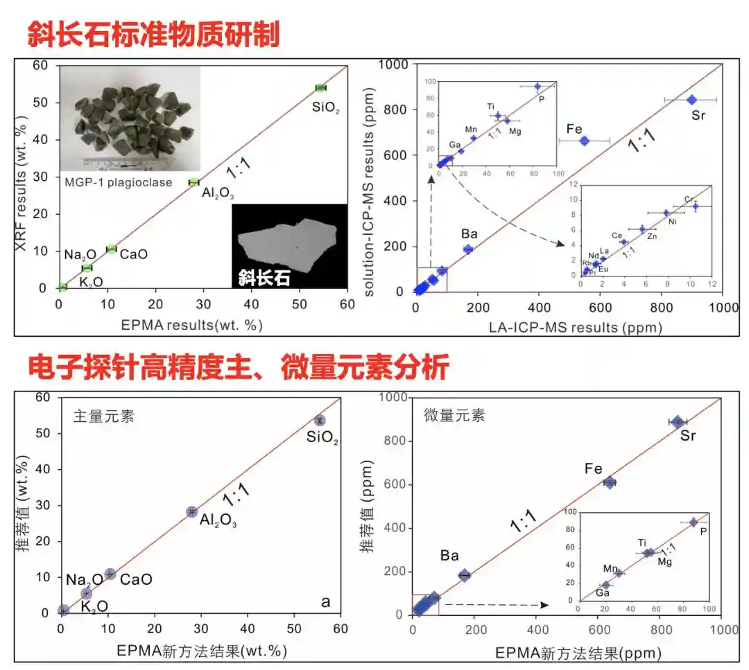月球背面是我国深空探测的主要战略方向,可研究太阳系早期撞击历史和月球地质演化等科学问题。由斜长石组成的高地斜长岩对于研究月球早期岩浆洋演化和初始月壳成分意义重大。然而,前人对这类斜长石的微量元素研究较为薄弱。由于月壤样品大多为微米级矿物颗粒,且斜长石往往具有复杂精细的成分环带,传统微量元素分析方法均属有损分析,且分辨率无法满足月壤的测试需求。电子探针斜长石微量元素分析面临检出限高、分析精度差以及缺少监控标样等一系列难题,是当前电子探针显微分析的国际前沿技术。