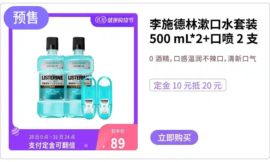 这次李施德林漱口水套组预售开团价99元,预付定金10元抵20元,到手价89元享4件。内含:1000mL李施德林零度漱口水(500mL*2),7.7mL薄荷口喷2支。