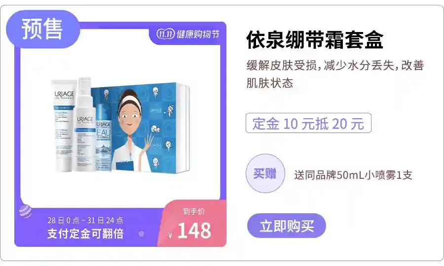 现在入手依泉CICA套装,原价249元,预售价仅需148元!足足降了100元,现在买还送同品牌50mL活泉喷雾1支,方便随时随地补水保湿。