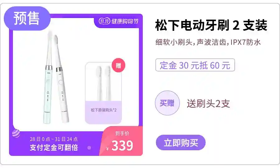 这款电动牙刷单支平时卖214元,现在2支到手只需339元,算下来单支169元,立省89元,还赠送刷头2支,到手一共4支刷头。