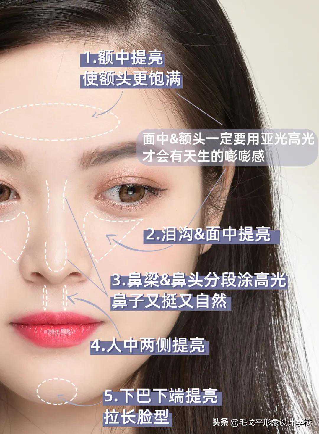 额中提亮,使额头更饱满;泪沟面中提亮;注意面中和额头位置的提亮一定要用亚光高光,才会有天生的嘭嘭感~
