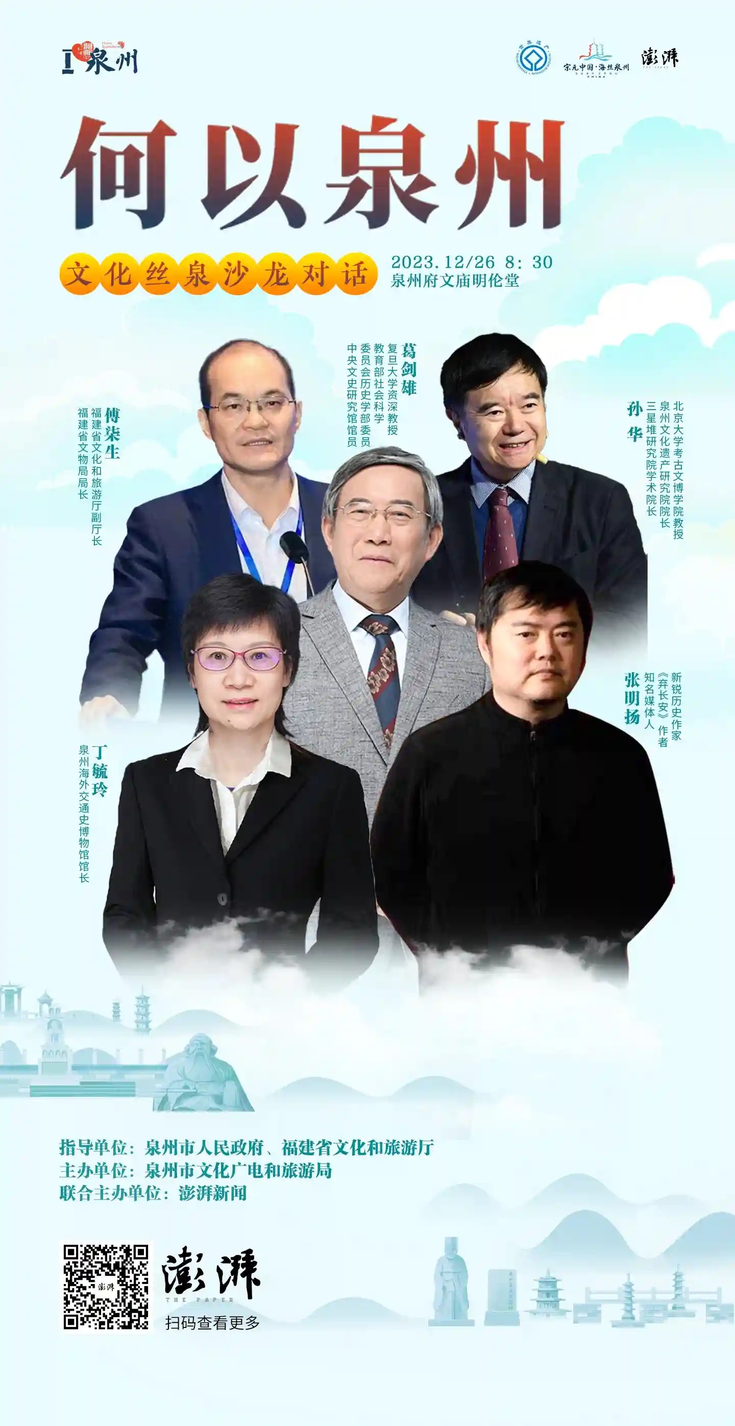 届时,复旦大学资深教授、教育部社会科学委员会历史学部委员、中央文史研究馆馆员葛剑雄,北京大学考古文博学院教授、泉州文化遗产研究院院长、三星堆研究院学术院长孙华,福建省文化和旅游厅副厅长、福建省文物局局长傅柒生,新锐历史作家、《弃长安》作者、知名媒体人张明扬,泉州海外交通博物馆馆长丁毓玲将共同对话,聚焦泉州如何做好“保护传承”和“创新利用”两篇文章、推动文旅经济做强做优做大等内容,以不同领域、不同视角开展一场头脑风暴,提供鲜活、深度的观点和见解。