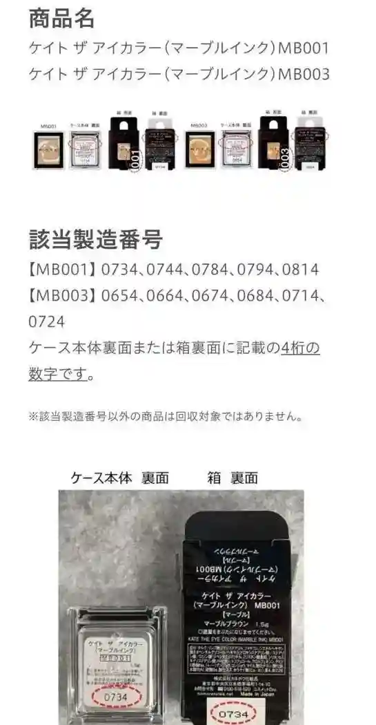 召回公告显示,自主回收的目标商品为“KATE眼影(水墨大理石)”的MB001和MB003两种色号,具体的受影响制造编号也已列出。顾客可以通过检查商品包装盒背面或容器背面的四位数制造编号来确认是否为回收对象。