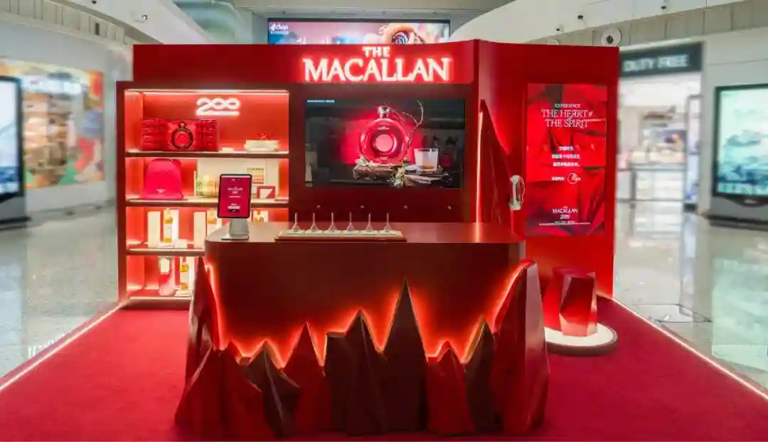 苏格兰单一麦芽威士忌品牌麦卡伦,为礼赞品牌200周年,于广州白云国际机场及上海浦东国际机场揭幕麦卡伦「时:空」免税快闪店。设计灵感来自品牌的历史与传统中的标志性元素,以耀红色“自然的锋芒”昭示自然的守护,以精湛制酒技艺呈现酒液自然色泽。