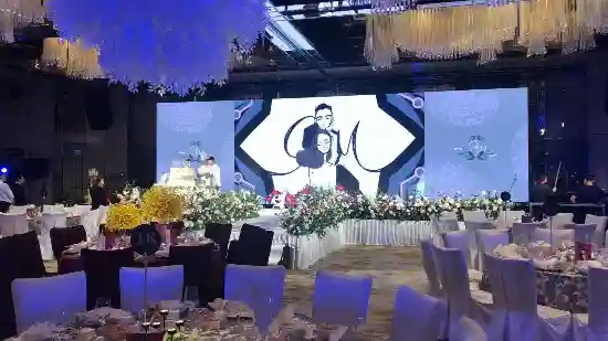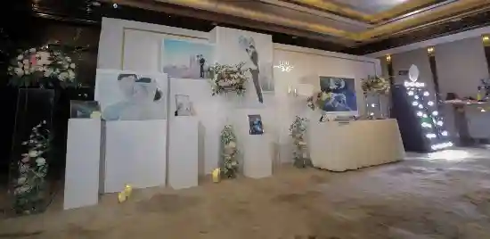 婚礼内场以白色为主色调,花团锦簇,以二人漫画形象做背景,婚宴上还装饰了两人的婚纱照,非常的清新浪漫。