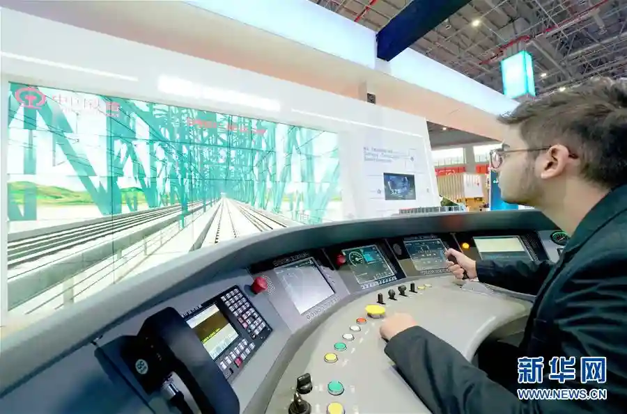 11月5日,在中国国际进口博览会的国家贸易投资综合展(国家展)上,一名格鲁吉亚政府代表团成员在中国馆内体验驾驶高铁。新华社记者陈建力摄