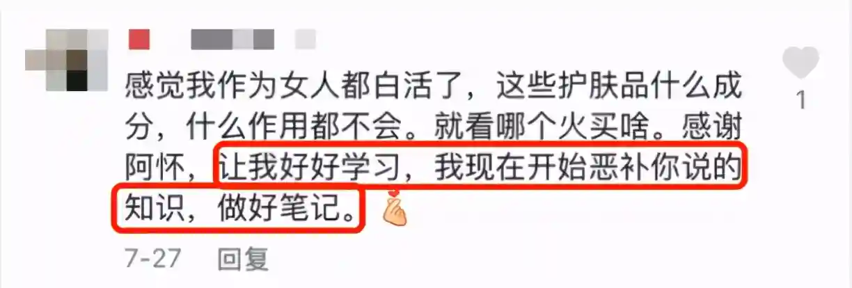 阿怀的小范围“出圈”是从一场骂战开始的。抖音博主“大分子实验室”称某国货品牌“六胜肽含量不足”,阿怀回怼了这位博主,最后以对方道歉收场。此事不仅让阿怀立稳了专业人设,还给粉丝留下了她“力挺国货”“为国货正名”的形象。