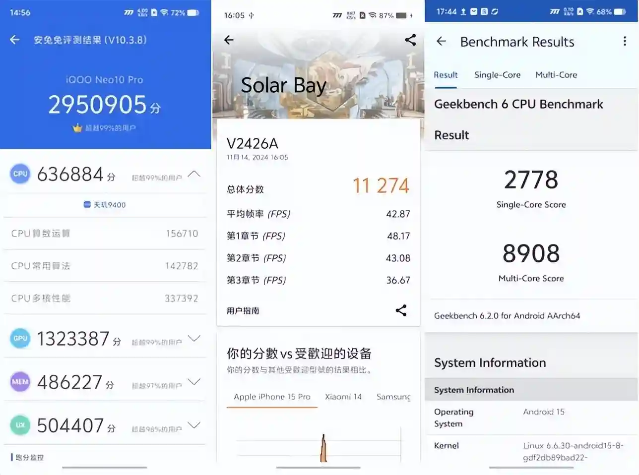 从结果可以看出,iQOONeo10Pro安兔兔跑分可以达到2950905,这个成绩已经可以轻松驾驭各种大型手游。在3DMarkWildLifeExtreme的测试中,iQOONeo10Pro总体分数6509,GeekBench单核成绩2778,多核成绩8908。