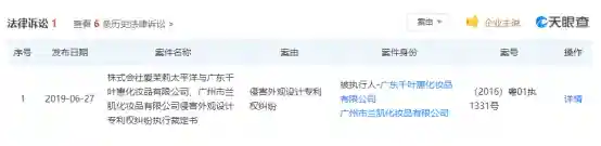 据天眼查,广东千叶惠化妆品有限公司还曾因侵害外观设计专利被株式会社爱茉莉太平洋起诉,法院裁决该公司立即停止销售这一专利包装产品并赔偿株式会社爱茉莉太平洋损失。