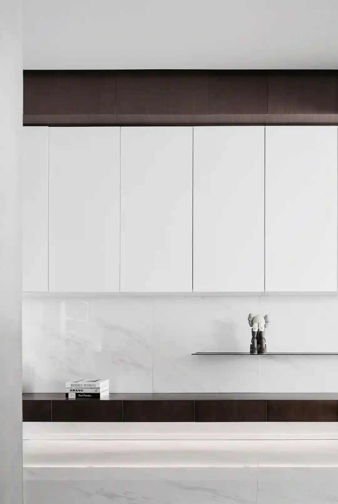 ▲侧边悬空定制收纳柜+搁板组合,还有一排白色的吊柜,再加上简雅的墙面与墙面砖,使得空间充满干净优雅而实用的氛围感。