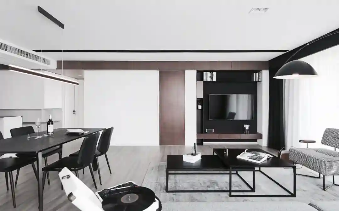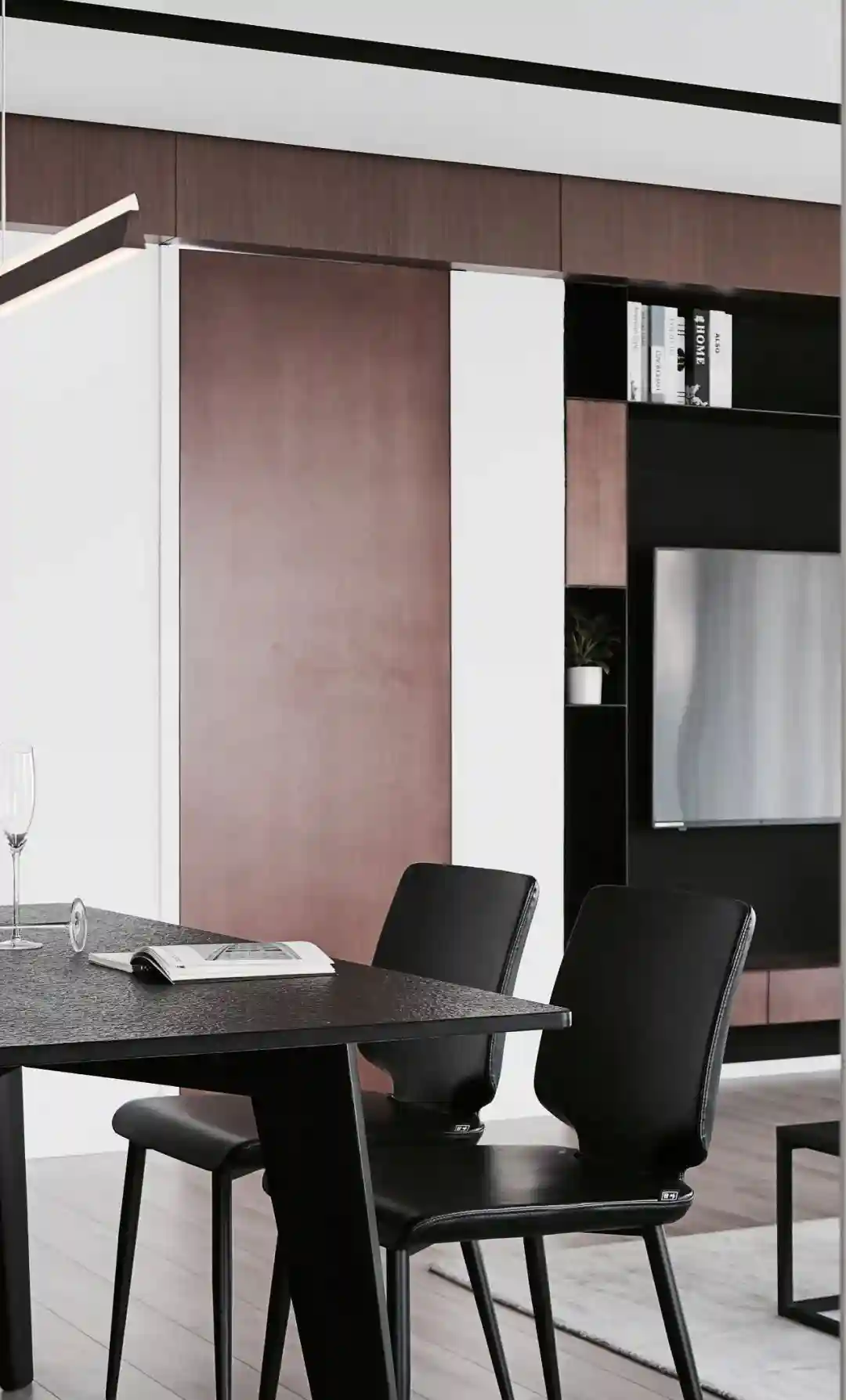 ▲客厅电视墙以深色的墙面背景基础,装上悬空电视柜,左侧加入了一道木饰面材质的隐形门,天花加入一圈的木质感装饰,搭配上黑色的极简茶几与餐桌椅相呼应,呈现出一种极简高级的端庄与档次气质。