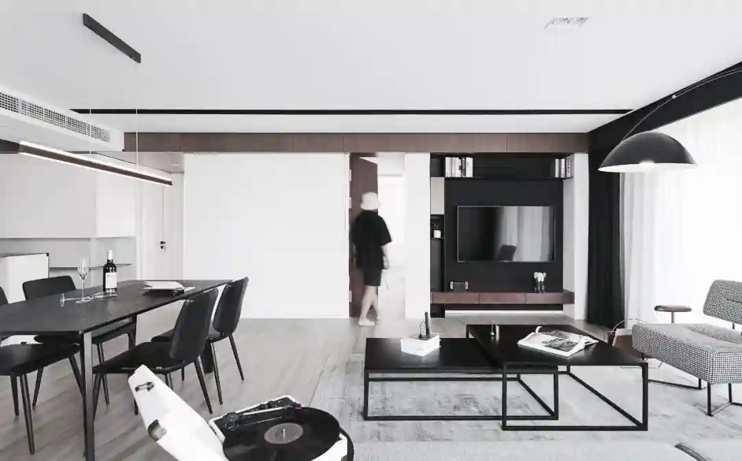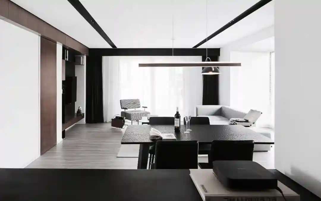 ▲客厅的沙发靠窗不靠墙,浅灰色布艺沙发与黑白配的空间相搭;餐厅布置黑色岩板餐桌、天花上加入黑色的造型线条,结合白色窗帘与墙面,使得空间充满舒适精致的美感。