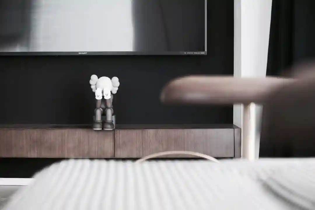 ▲悬空电视柜上摆着独特的艺术摆饰品,在深色背景墙+木质悬空柜的结合下,也带来了一种独特优雅的空间体验。