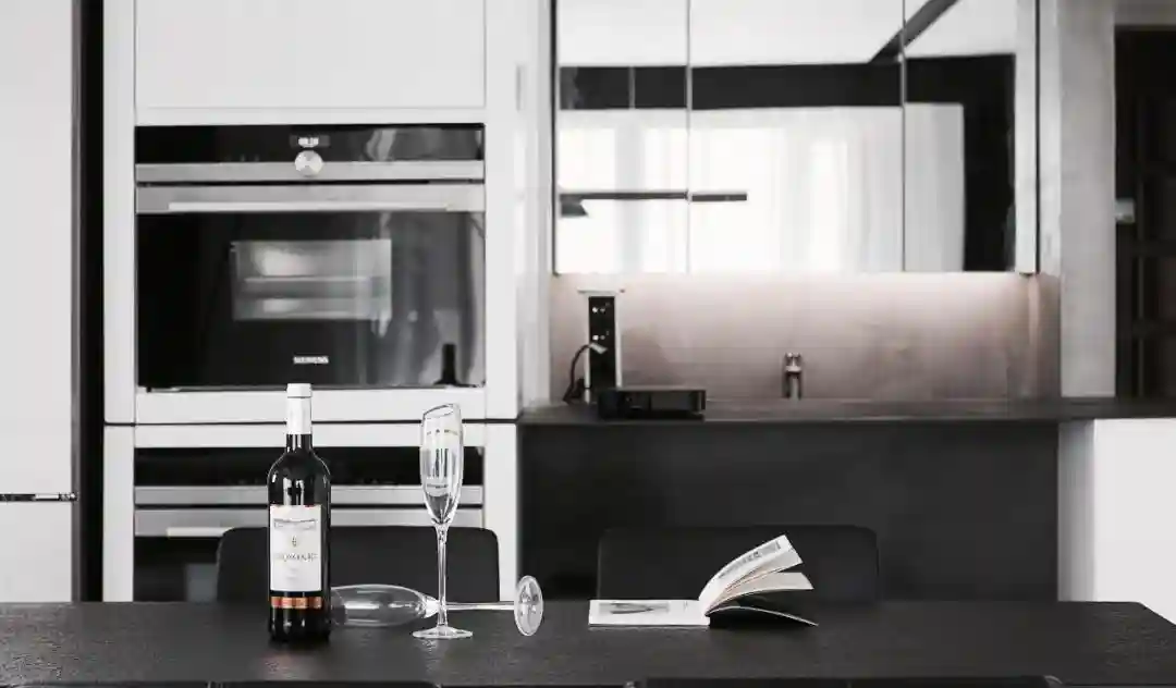 ▲餐厅后方的餐边柜,定制上嵌入电器柜,烤箱与蒸箱嵌入其中,黑白配的空间设计,结合餐桌上的红酒与酒杯,也让空间显得现代时尚而情趣。