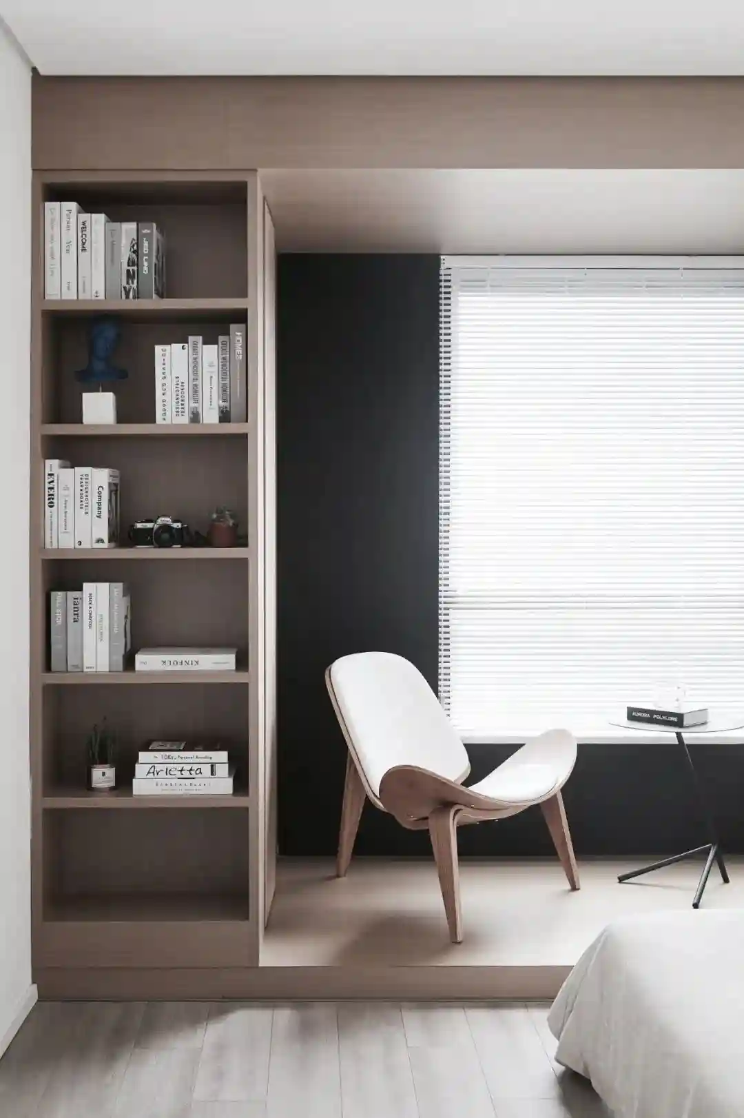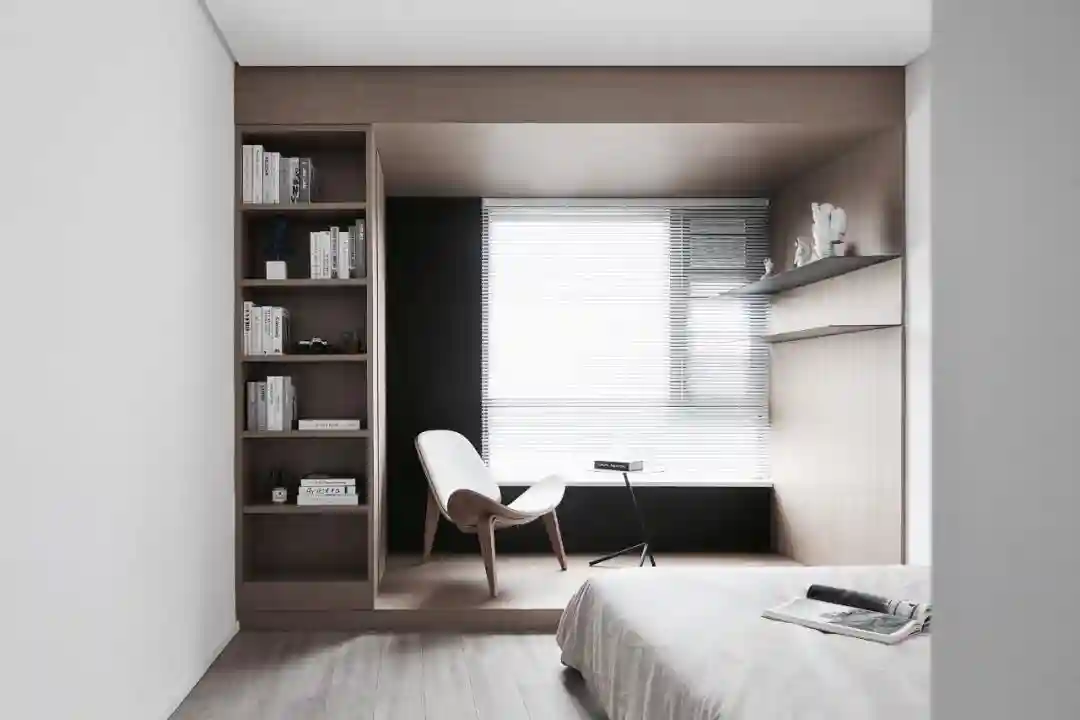 ▲卧室在简洁的墙面与天花设计基础,在窗户的处理上投入较大,做了一个地台+木质天花,左边定制一个书架、右边装上悬空隔板架、并在隔板架上布置精致的摆饰品,也让简洁的卧室显得更加华丽大气。