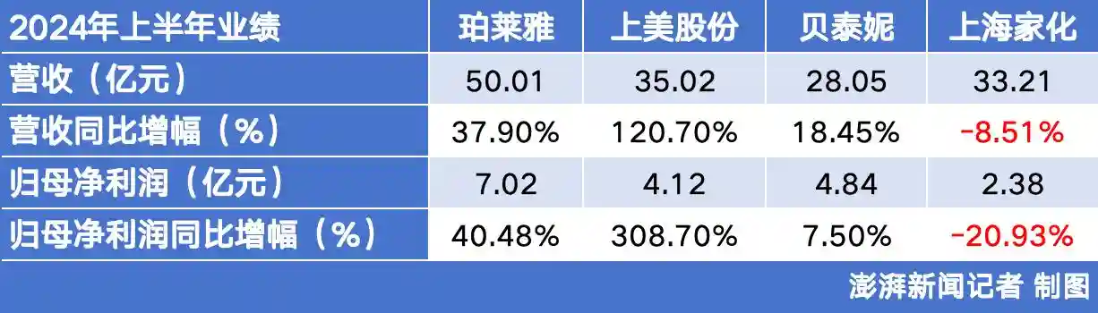 近日,珀莱雅(603605.SH)、上美股份(02145.HK)、贝泰妮(300957.SZ)、上海家化(600315.SH)四大上市国货美妆公司陆续披露了2024年上半年业绩。除上海家化外,三家营收净利均创历史新高,其中上美业绩实现倍增,珀莱雅和贝泰妮稳步增长,而上海家化营收、净利润则双双下滑。