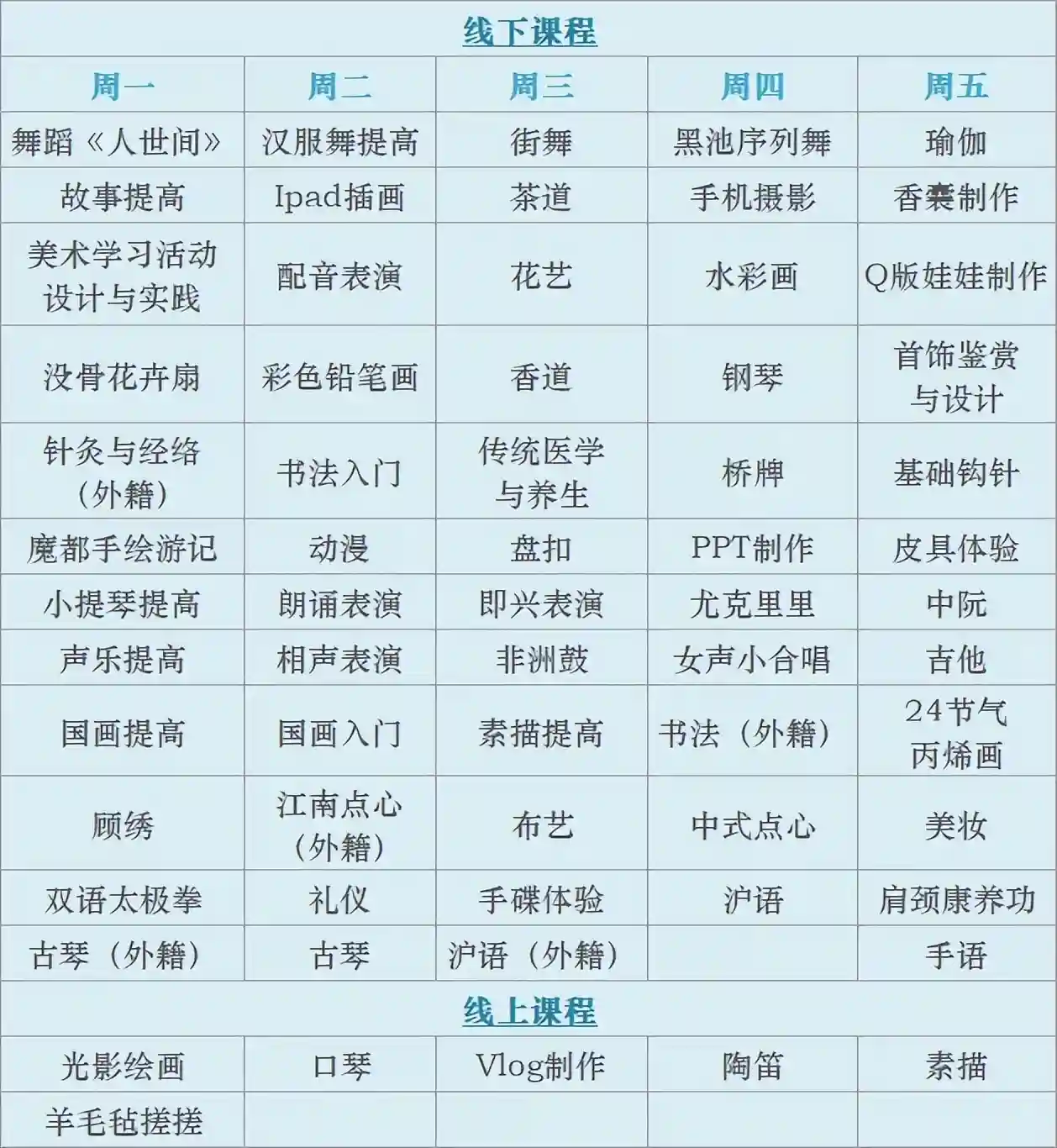 爵士演唱/相声/iPad插画/巴西柔术/非洲手鼓/美妆体验/工笔画入门/蓝染/戏剧表演/合唱基础入门/配音表演入门/陶笛/零基础手工皮具体验