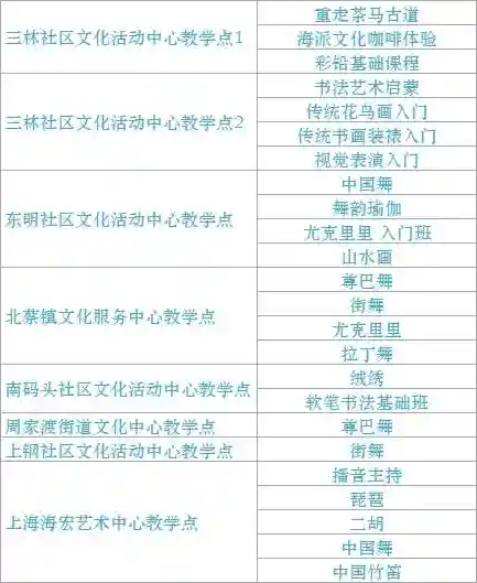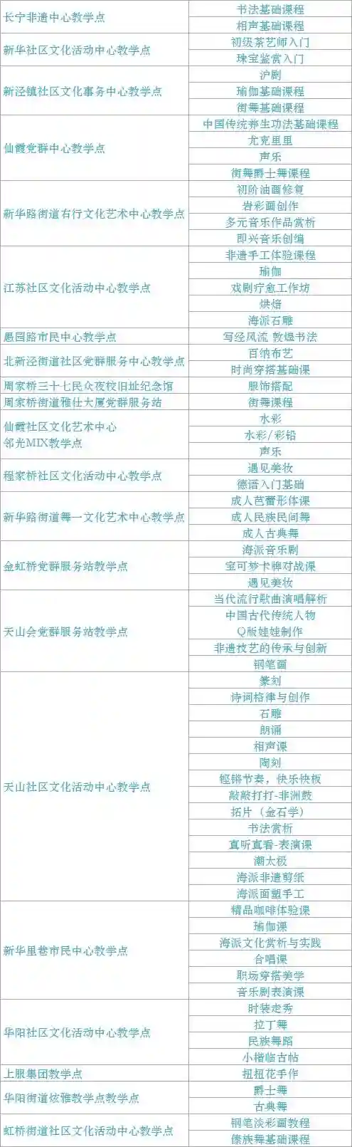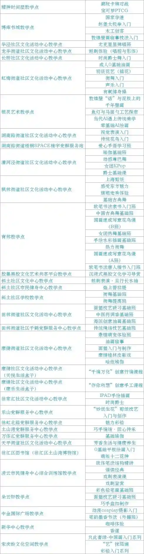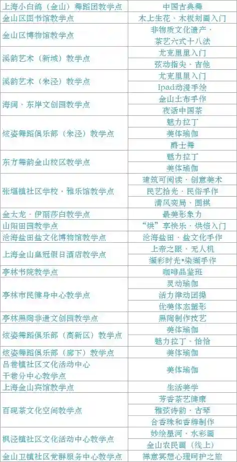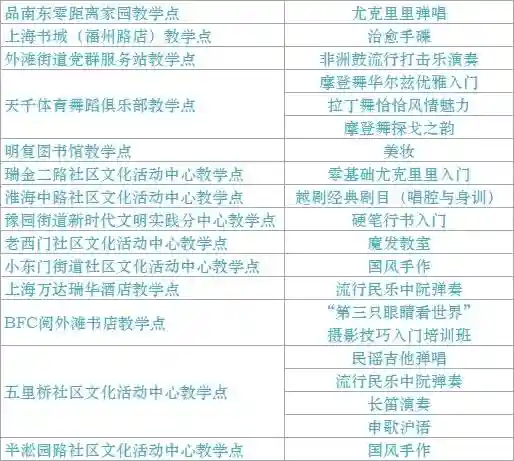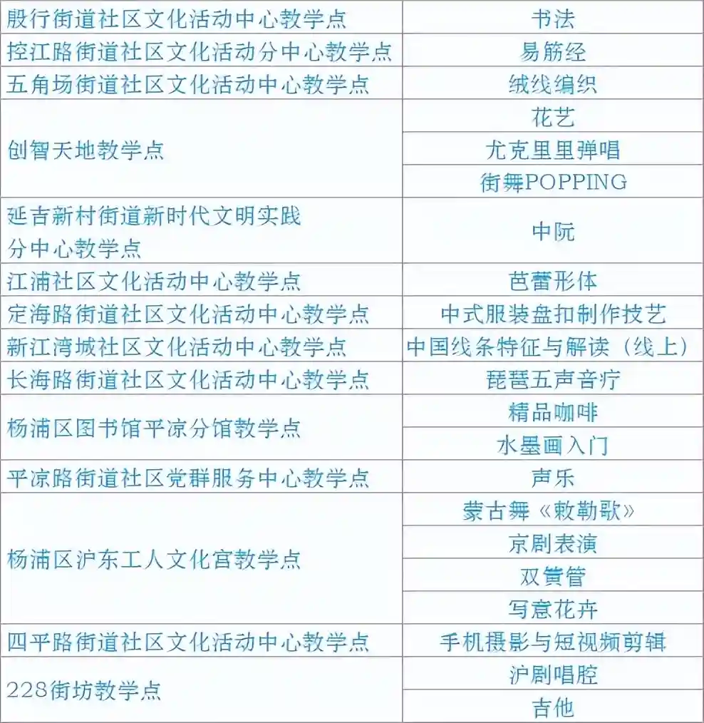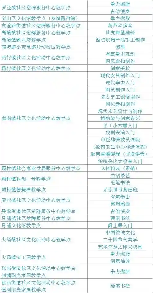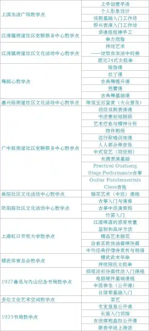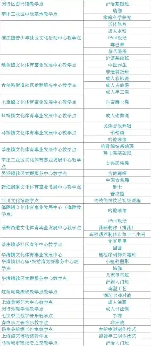 跟我来学上海话/上海说唱及沪剧教唱/法绣/综合配饰/形体模特/粤语基础/面点制作/传统杨氏太极拳/燃脂尊巴/瑜伽肩颈理疗/拉丁舞/面点/书法/篆刻/美妆/美甲/茶艺/日语/咖啡