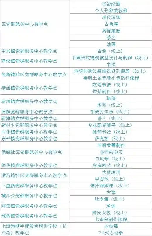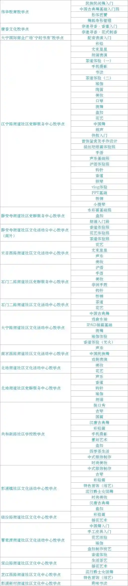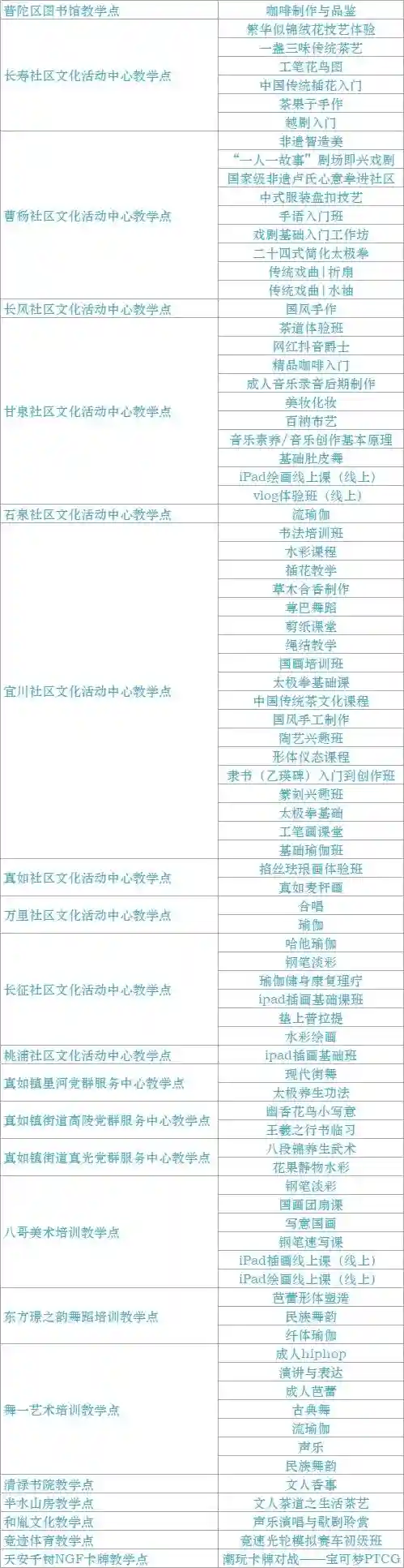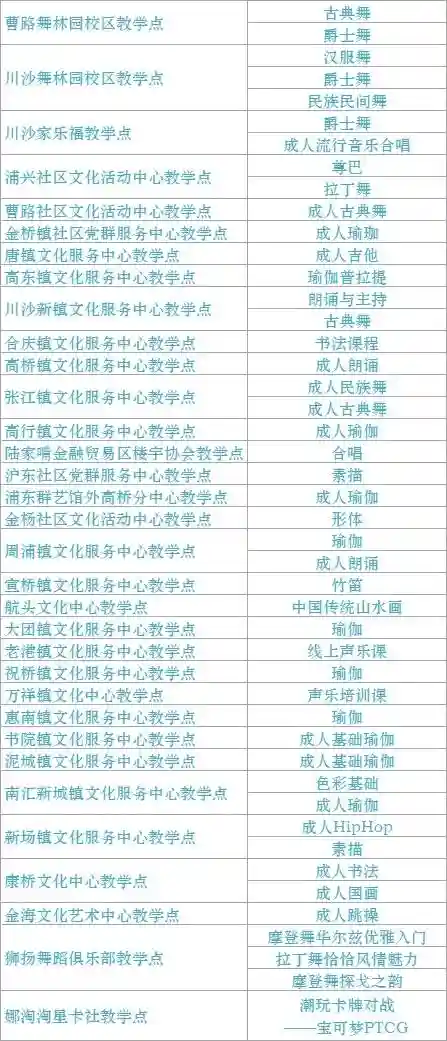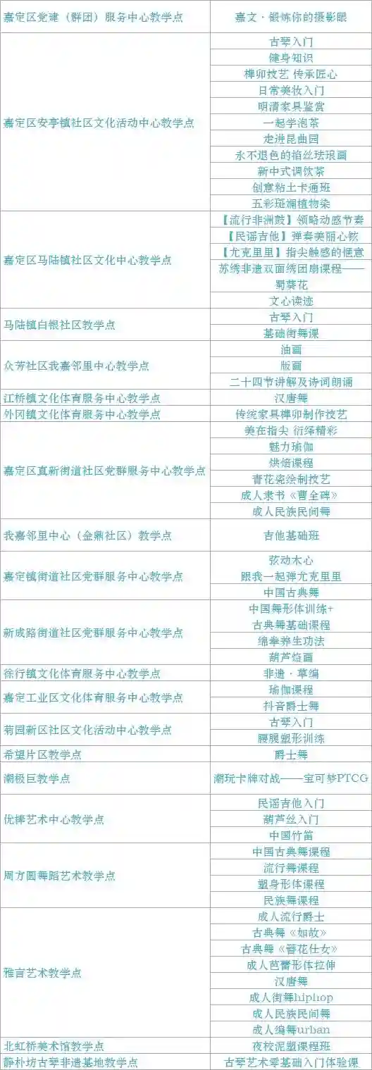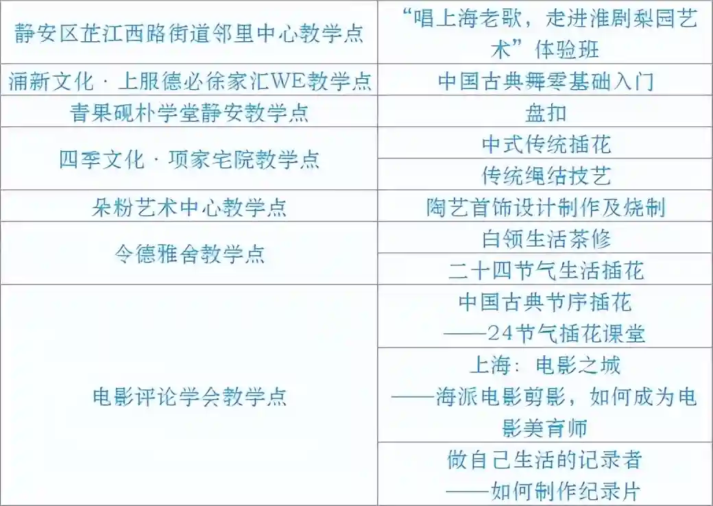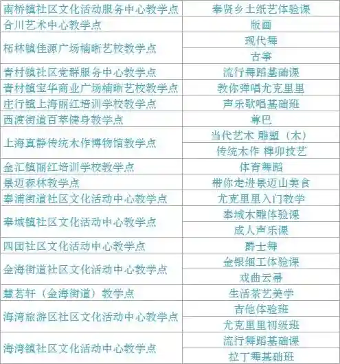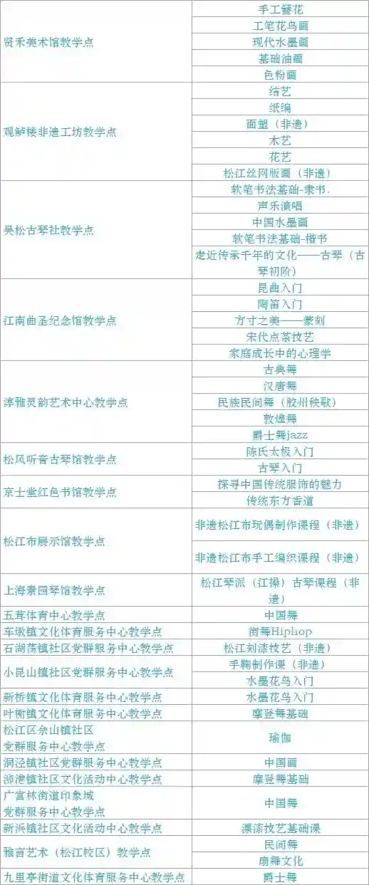 跟我来学上海话/上海说唱及沪剧教唱/法绣/综合配饰/形体模特/粤语基础/面点制作/传统杨氏太极拳/燃脂尊巴/瑜伽肩颈理疗/拉丁舞/面点/书法/篆刻/美妆/美甲/茶艺/日语/咖啡