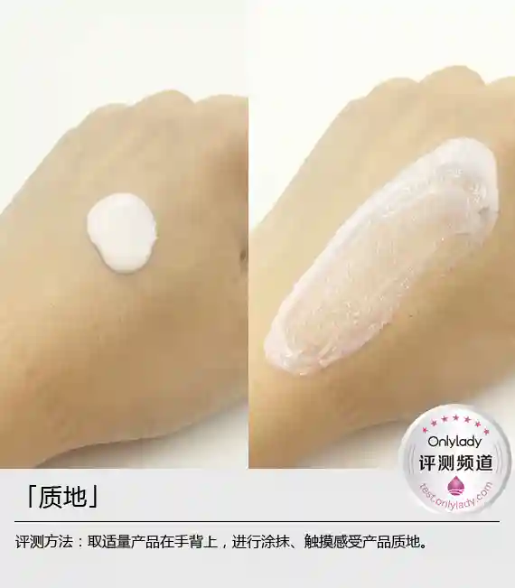 资生堂新艳阳夏臻效水动力防护乳的质地呈现清透的水状乳液,鼻子嗅过之后发现它没有明显气味;涂抹在手背上非常容易被推开,由此说明这支防晒乳的延展性不错,能够迅速被肌肤吸收,不用担心搓泥的现象哦!