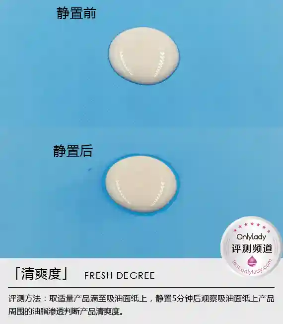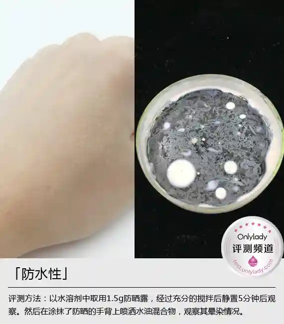 在喷洒水油混合物后,20分钟后没有出现浮粉、溶解等现象,由此说明此款防晒在遇到水之后不会影响防晒效果;通过观察培养皿中的防晒乳可以看到,产品基本没有被溶解,其在培养皿中重现圆润的球状。值得一提的是,此款防晒乳还采取了Wetforce水动力防护技术,其主要功效就是,当它湿水或浸汗时,防晒能力能上升至123%,可谓是世界首个在有水的条件下防护能力提升的防晒科技。