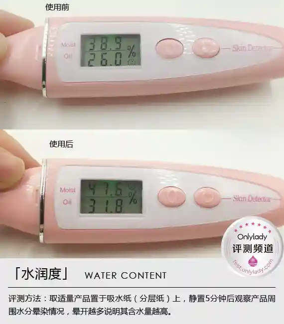 涂抹前,我们测得肌肤水分值为38.9%,肌肤状态还是蛮好的。使用了产品之后,我们测试得到肌肤水分值为47.6%.整体来讲,保湿效果不错。另外此款防护乳中蕴含细胞DNA损害或酵素活性,能够有效的防御皱纹或色斑的生成。