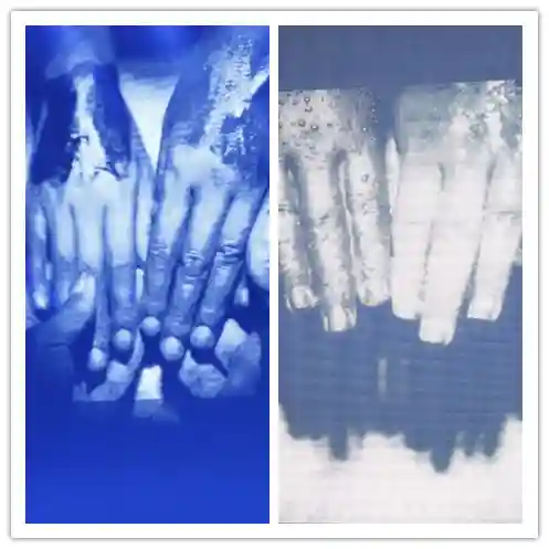 仅仅是口述还不能够表达这支“黑科技防晒乳”遇水则强的防晒效果,所以在这款产品的新品发布会上我们用UVCamera进行了测试。上面两张图片是抹了资生堂新艳阳夏臻效水动力防护乳和普通防晒霜后放入水中的景象,从对比图片中可以清晰的看到,涂抹了资生堂新艳阳夏臻效水动力防护乳的手在UVCamera的拍摄下更黑,所以其抵抗紫外线能力要比一般的防晒霜强大很多,由此也就说明了它遇水则强的防晒效果。