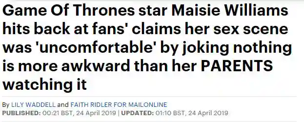 英国媒体4月24道,《权力的游戏》中二丫的扮演者本周陷入了各种舆论风暴,其中多数是批评第八季第二集中她与前国王私生子的激情戏。多数网友对此表达了共同的感受——不舒服。整个情节来得太突兀,观众朋友没有任何准备。